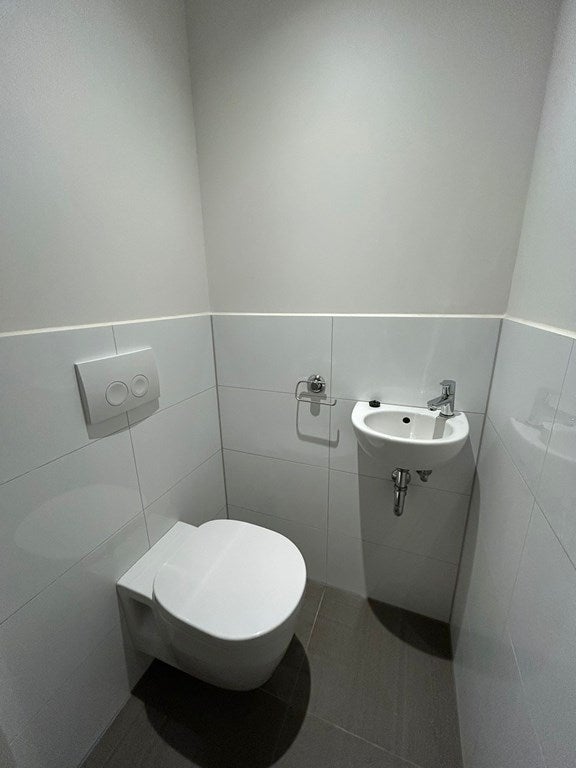 Het toilet is separaat van de badkamer en voorzien van een wandcloset en fonteintje, wat bijdraagt aan extra comfort en gebruiksgemak.