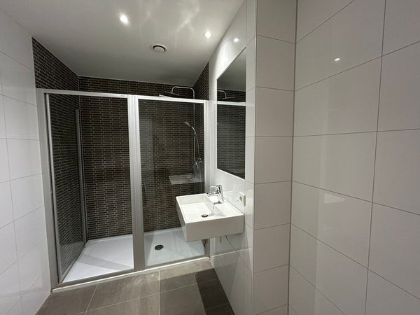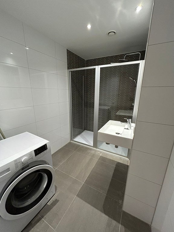 In het centrale middenblok bevindt zich de volledig betegelde badkamer. Deze is uitgerust met een ruime inloopdouche, wastafel en een aansluiting voor een wasmachine. De badkamer is functioneel ingedeeld en onderhoudsvriendelijk afgewerkt.
