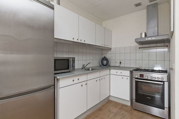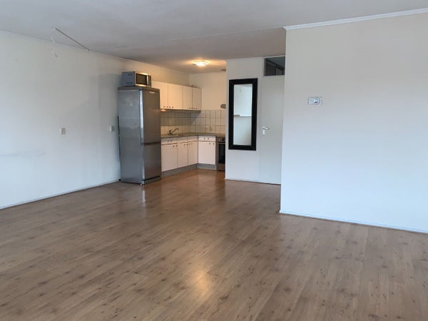 De ruime woonkamer is gesitueerd aan de voorzijde van de woning. Tevens is de woonkamer voorzien van een loopdeur naar het balkon, welke is gesitueerd aan de voorzijde (zuiden). De woonkamer staat tevens in verbinding met de open keuken. Deze is voorzien van een roestvrijstalen spoelbak. Koelkast met vriescombinatie, gaskookplaat met oven, afzuigkap en losse magnetron.