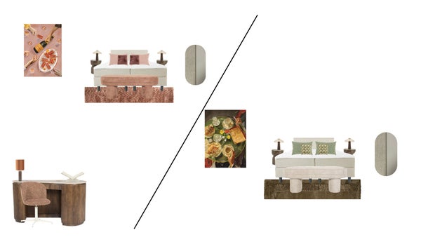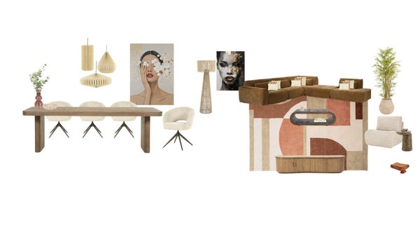 De meubels zoals weergegeven op het moodboard betreffen de daadwerkelijke inrichting van het appartement; deze zijn specifiek voor deze woning geselecteerd en besteld.