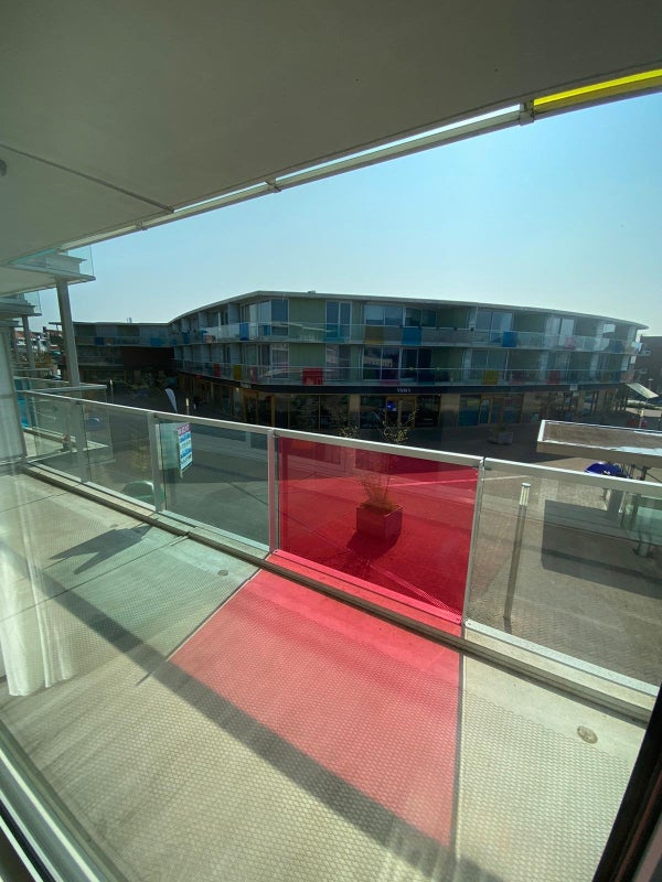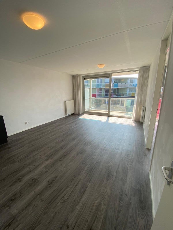 Deur naar ruime woonkamer, voorzien van pvc-vloer. Schuifdeur naar zeer riant balkon van ca. 15 m² op het Zuidoosten.