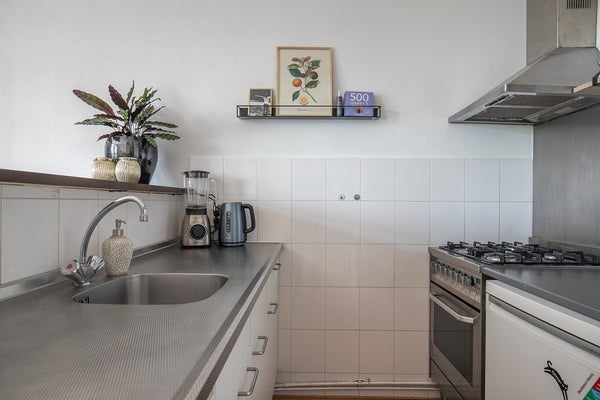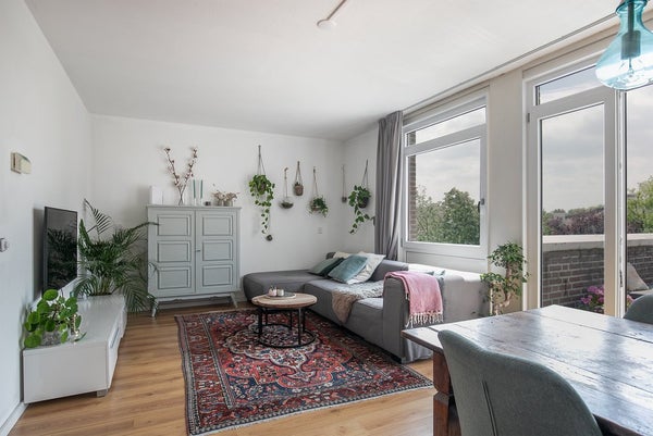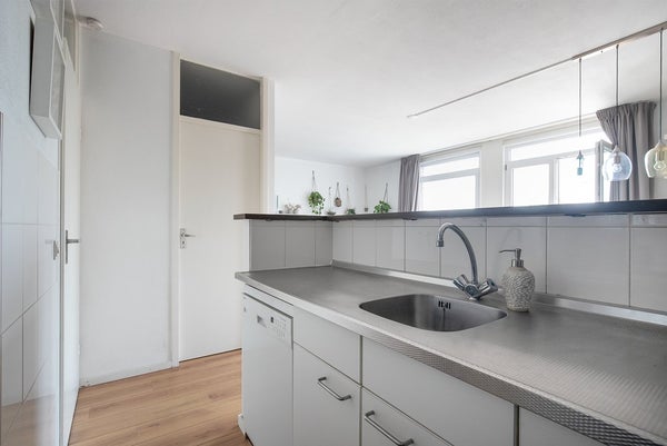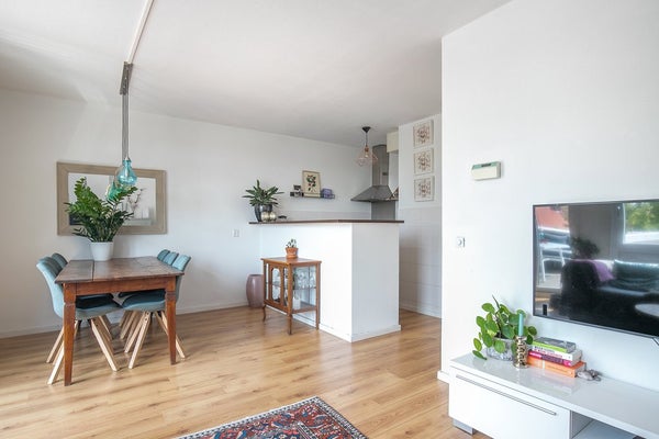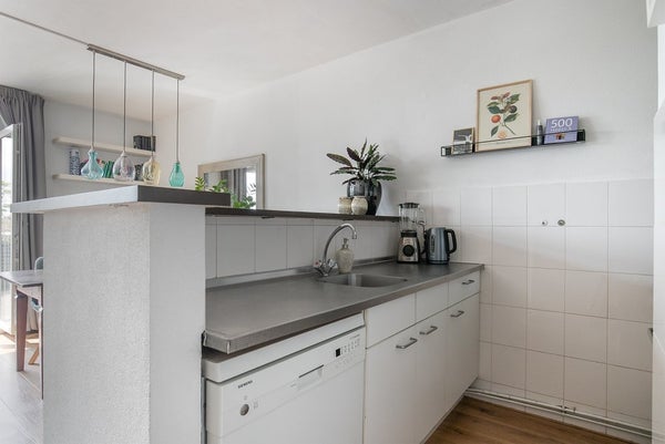 Lichte woonkamer met open keuken en openslaande deuren naar het zonnige balkon (9 m2).Eenvoudige maar complete keuken met alle gewenste apparatuur, zoals een vaatwasser.