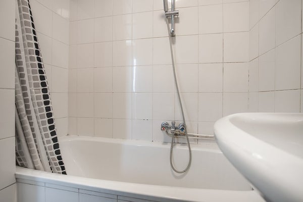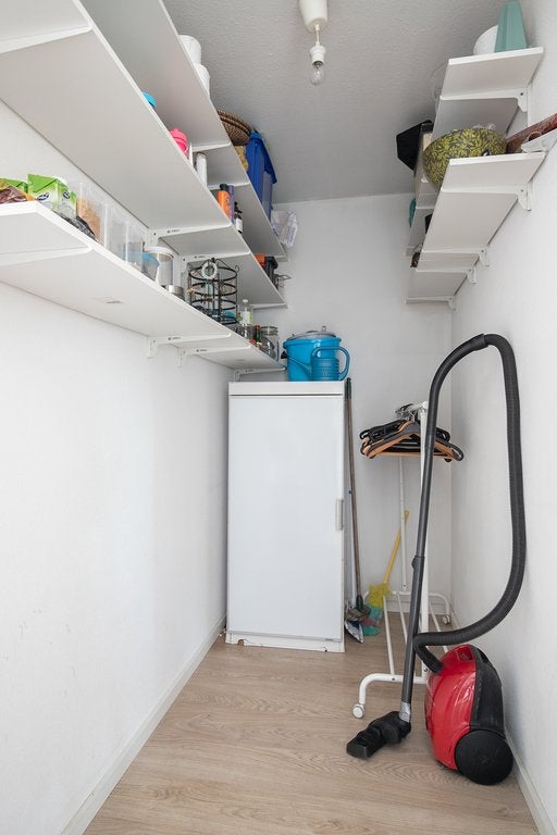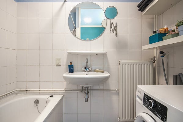 Ruime opbergkast. Badkamer met bad/douche en wastafel met plank en wasmachine.