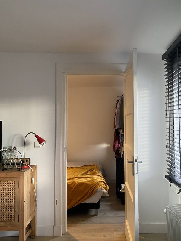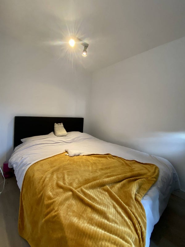 Via de woonkamer kun je de slaapkamer betreden. De slaapkamer is voorzien van een tweepersoonsbed.