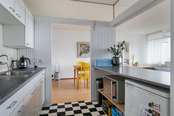 Open Keuken met eetbar: de apparatuur zoals de vaatwasser en wasmachine kunnen worden overgenomen. Voldoende boven- en onderkasten.