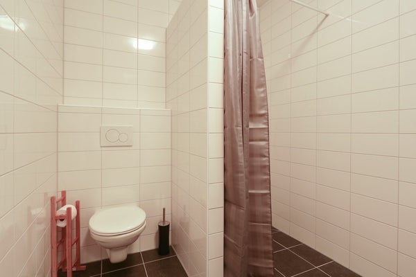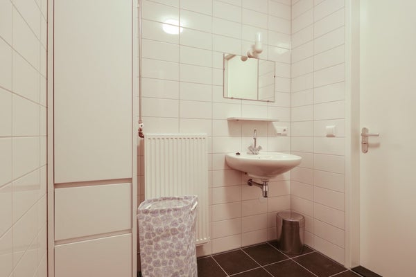 Luxe, grote badkamer met inloopdouche, wastafel, toilet en badkamerkast. Aparte berging (in het appartement) met wasmachine en droger.