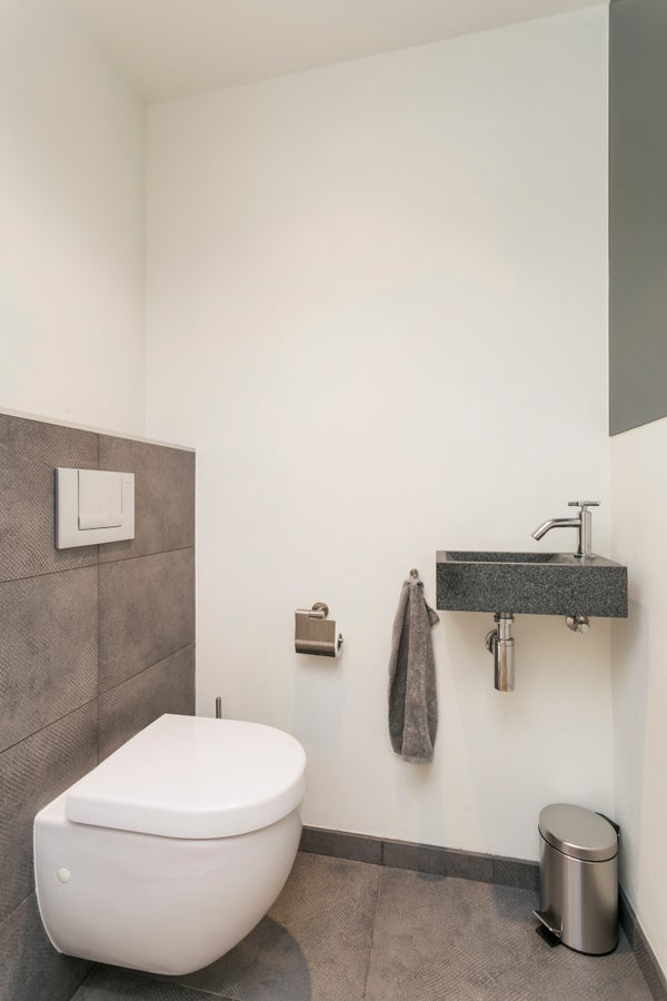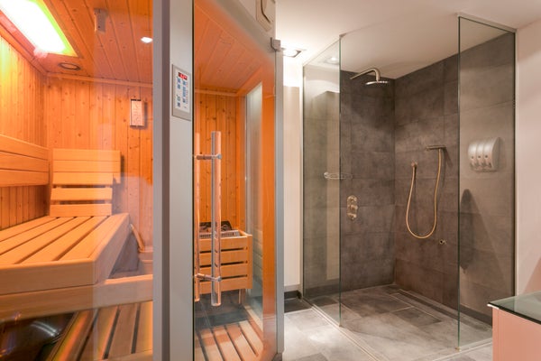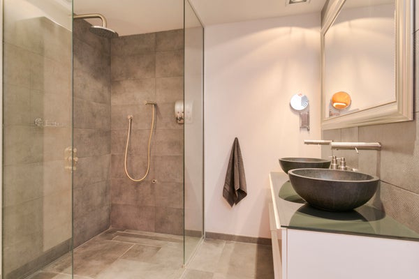 De badkamer is volledig betegeld en uitgerust riante inloop douche, dubbele wastafel en zelfs een sauna! Daarnaast is er een separate toiletruimte met hangend toilet en fonteintje.