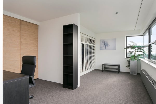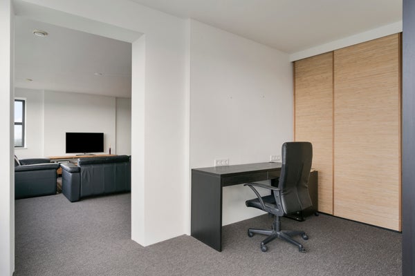 Het appartement beschikt over twee volwaardige slaapkamers en een fijne hoek die dienst kan doen als werkplek aan huis.