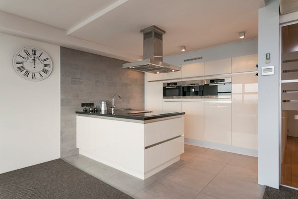 De open keuken is uitgevoerd in wandopstelling met kookeilind en voorzien van alle benodigde inbouwapparatuur: inductiekookplaat, afzuigkap, oven, vaatwasser, koelkast en spoelbak.