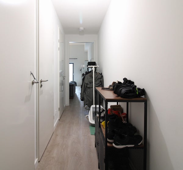 Entree tot het appartement naar de hal, van waaruit u de woonkamer, het toilet, de badkamer, en de berging kunt betreden.