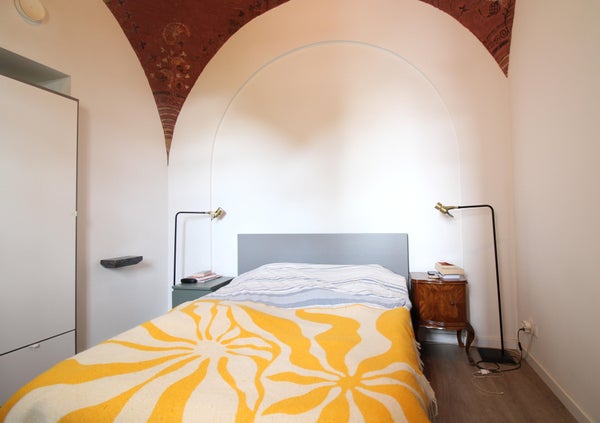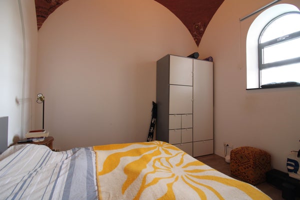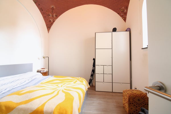 De slaapkamer treft u aan de achterzijde, en beschikt over de karakteristieke kerkraam en orignele plafond. De kamers valt individueel in temperatuur te reguleren.