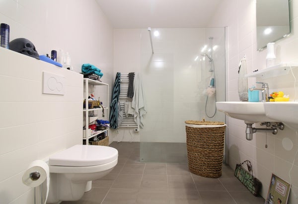 De volledig betegelde badkamer is uitgerust met een inloopdouche, toilet, en een dubbele wastafel met spiegels.