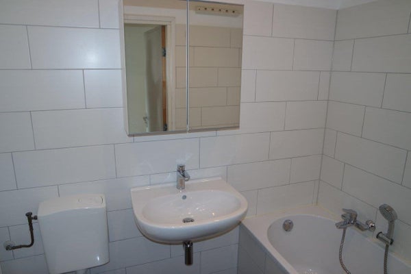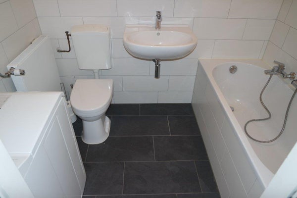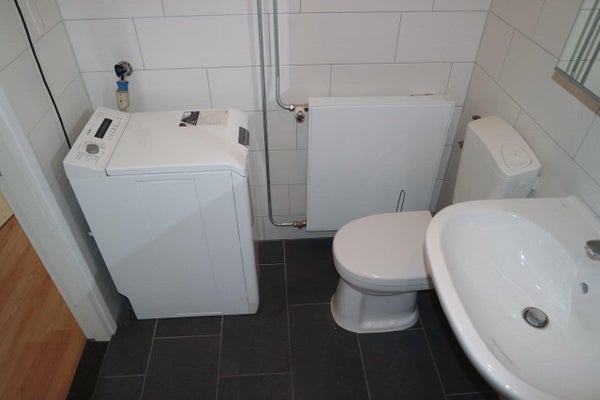 De betegelde en moderne badkamer beschikt over een ligbad, toilet, wastafel en wasmachine aansluiting.