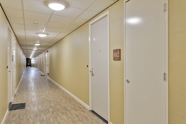 Naast de douche ligt de masterbedroom waar met gemak een tweepersoons bed en een kledingkast in kunnen. Aan de overzijde van de gang bevindt zich een extra tevens ruime slaapkamer. Beide slaapkamers bieden uitzicht op achterzijde van het complex.