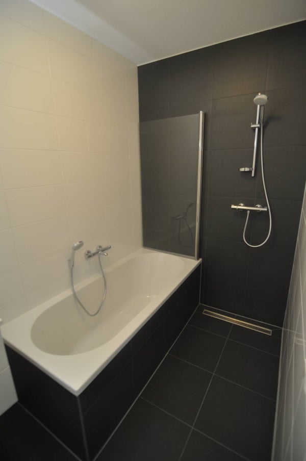 De geheel betegelde moderne badkamer is voorzien van een inloopdouche, seperaat bad en wastafel.