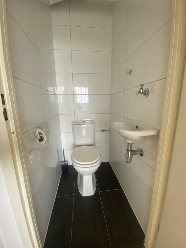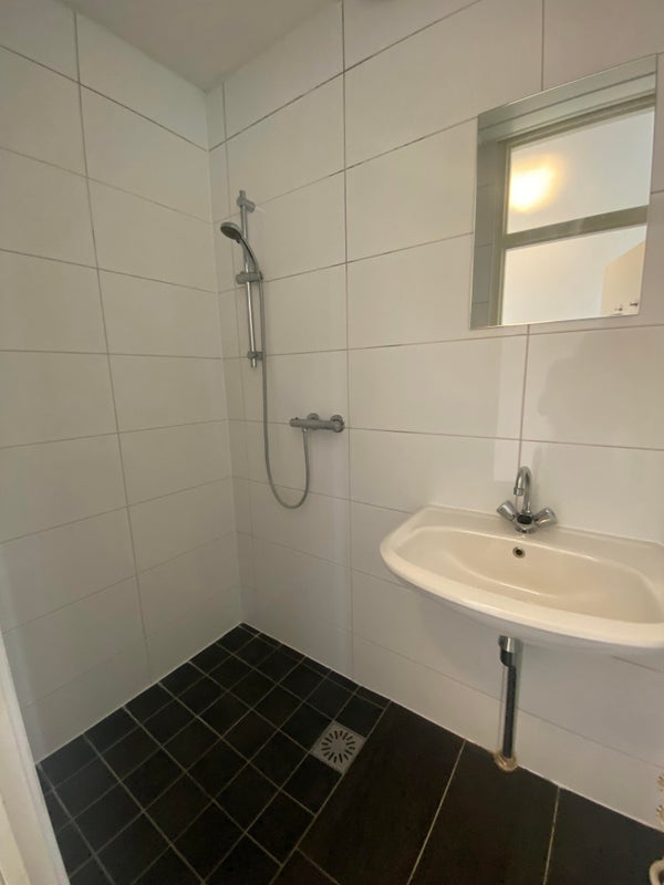 Geheel betegelde badkamer voorzien van een douche, wastafel en separate toilet.