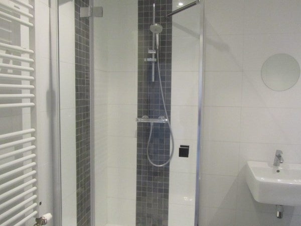 Geheel betegelde, moderne ruime badkamer met douchecabine, vaste wastafel, ligbad en designradiator.