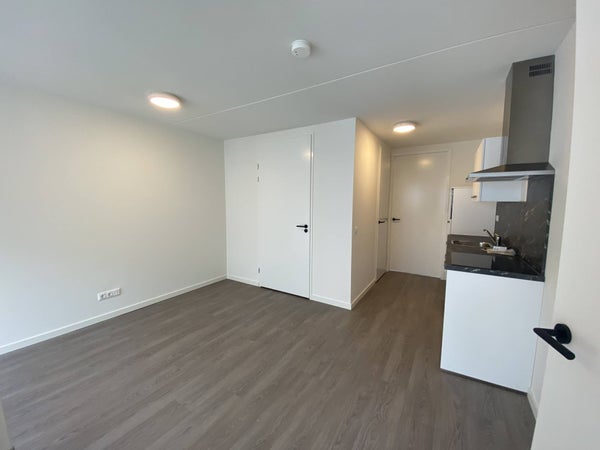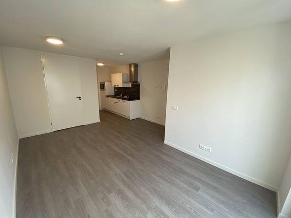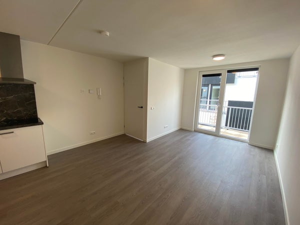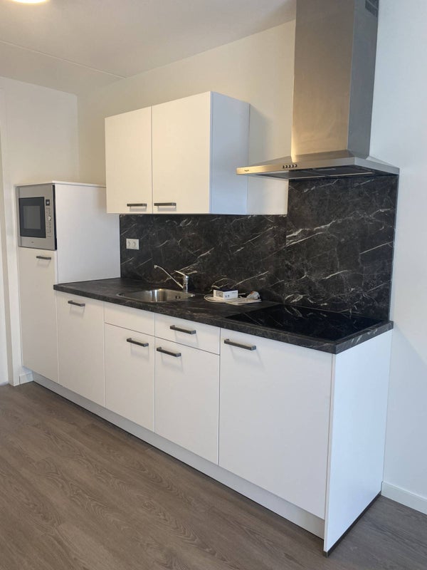 Binnenkomst in hal met toegang tot ruime woonkamer met open keuken. De woonkamer is voorzien van mooie pvc vloer, verduisterende gordijnen en verlichting. Het appartement beschikt over een open keuken in wandopstelling voorzien van inductie kookplaat, afzuigkap, vaatwasser, koelkast, combi magnetron, wastafel en diverse onder en boven kastjes.
