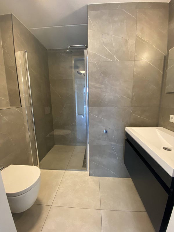 De woonkamer geeft toegang tot een moderne badkamer voorzien van inloop regendouche, zwevend toilet en wastafel met meubel. De badkamer is volledig betegeld met marmer look wandtegels.