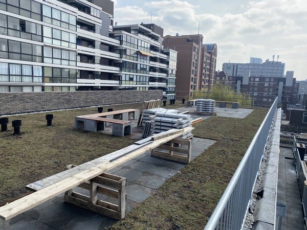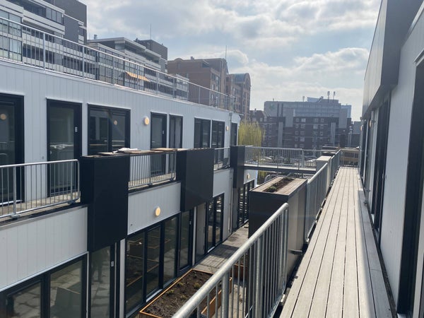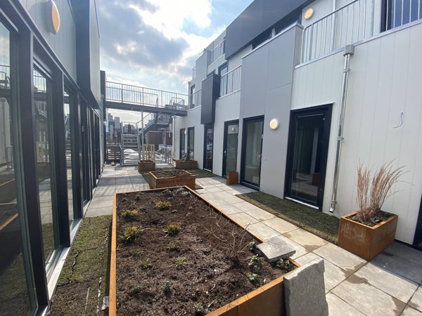 Trap toegang tot de galerij voorzien van borders met sierbeplanting. Het appartement is gelegen op de tweede verdieping. Op de derde verdieping bevindt zich een gemeenschappelijke stadstuin.