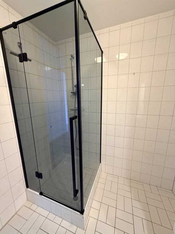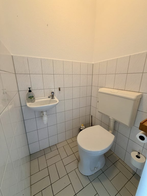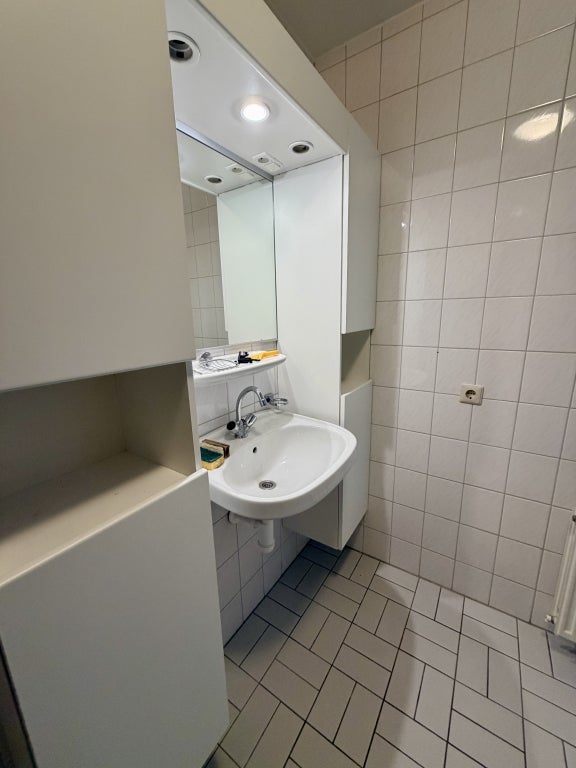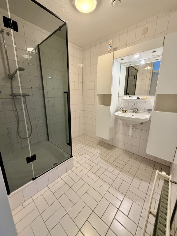 De badkamer is voorzien van een douche en wastafel, en er is een separaat toilet aanwezig.