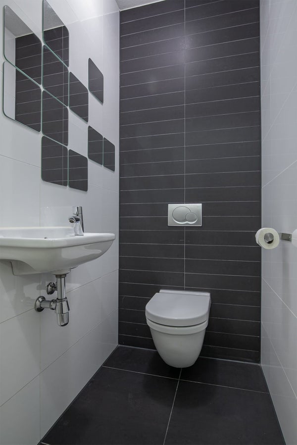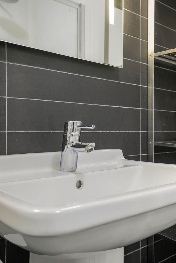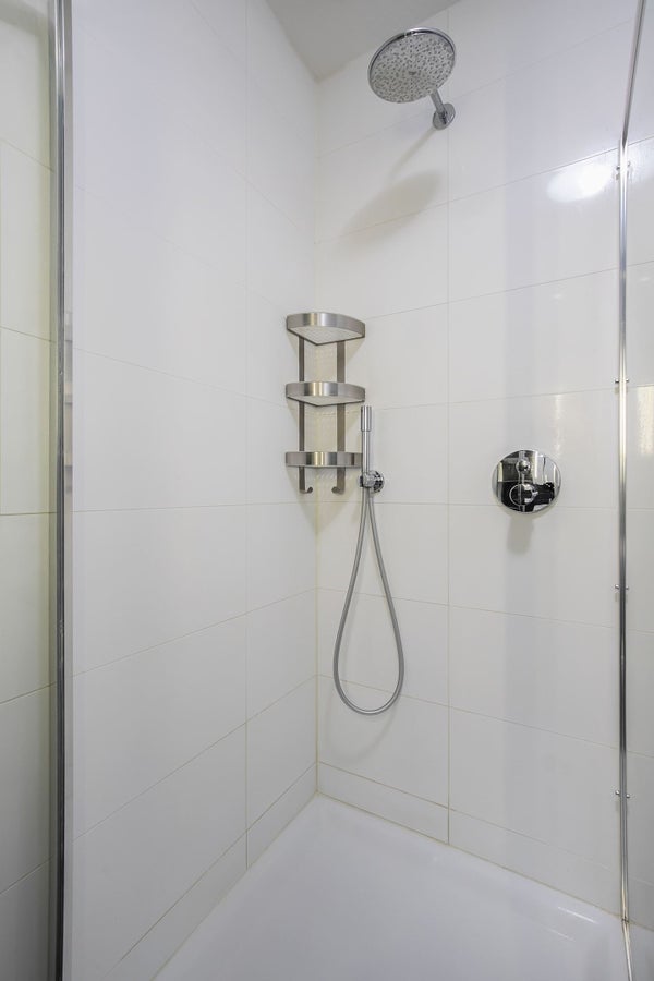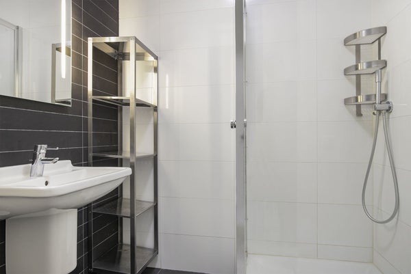 De bergruimte heeft een betegelde vloer met wasmachine en droger. De volledig betegelde badkamer is uitgerust met een douche en een wastafel in een mooi meubel.