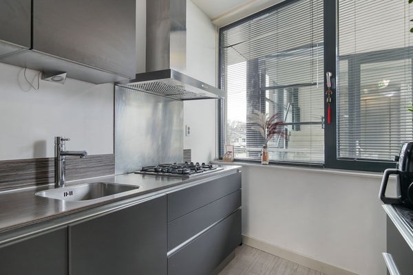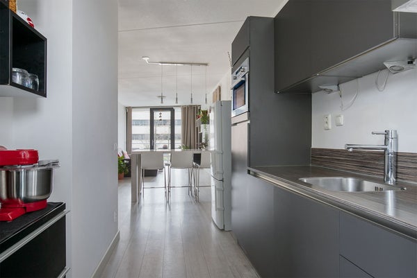 In de woonkamer bevindt zich de open keuken in een dubbele rechte wandopstelling. De keuken is voorzien van een lichtarmatuur, een werkblad met een RVS gootsteen en voldoende opbergruimte. De inbouwapparatuur bestaat uit een 4-pits gaskookplaat, een RVS afzuigkap, een koelkast, een vaatwasser, een combimagnetron en een ingebouwde koffiemachine.