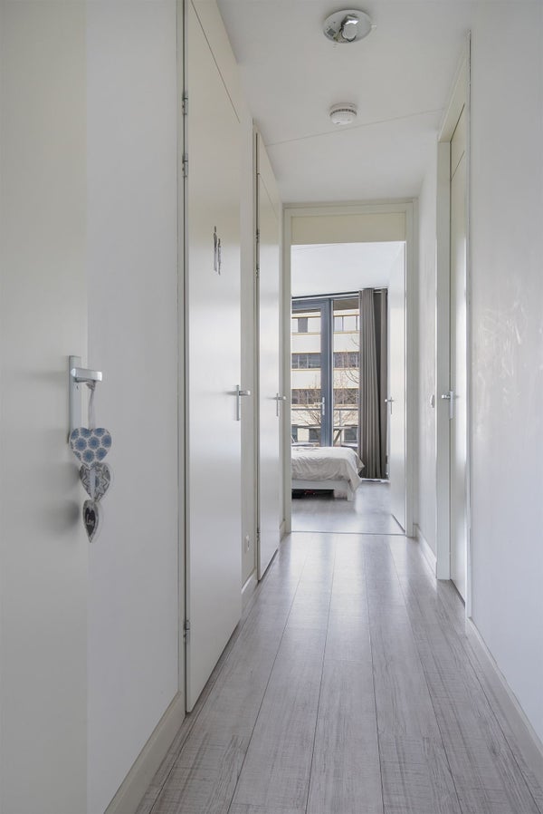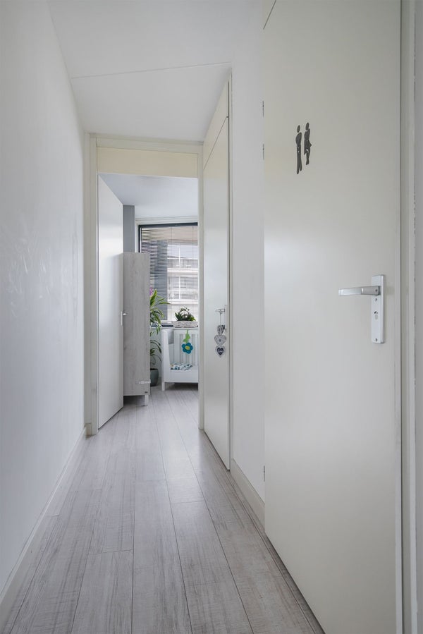 Je komt het appartement binnen via de ingang / hal met video-intercom, die toegang biedt tot achtereenvolgens de slaapkamers, de bergruimte, het aparte toilet, de badkamer en de woonkamer met open keuken. In de hal is ook de garderobe en de meterkast.