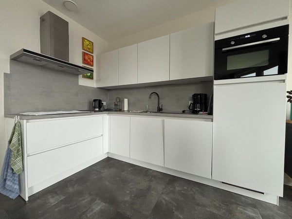 De keuken is voorzien van vaatwasser, inductie kookplaat, koelkast, inbouw oven, inbouw magnetron wasemkap en tevens voldoende opbergruimte.