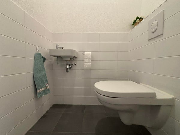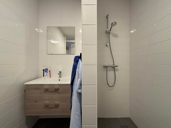 De badkamer is voorzien van douche en wastafelmeubel met voldoende opbergruimte.