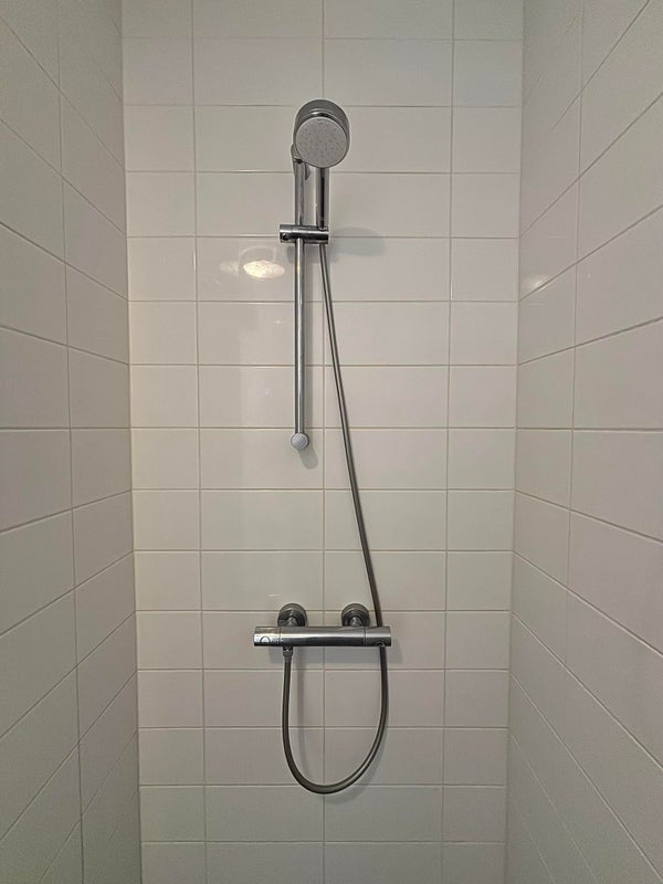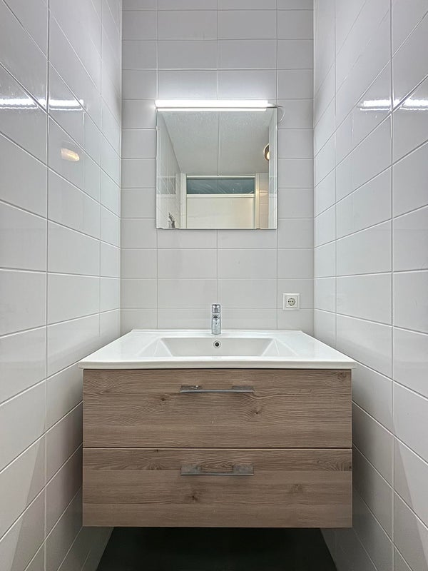 De badkamer is voorzien van douche en wastafelmeubel met voldoende opbergruimte.
