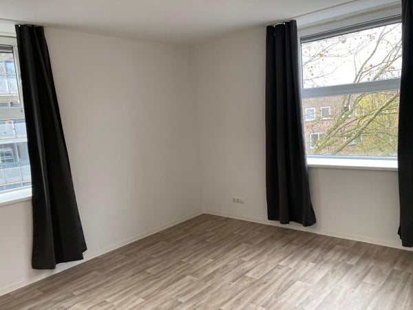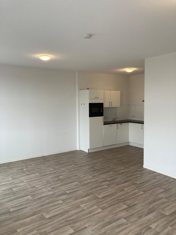 Een appartement met twee slaapkamers, badkamer en een woonkamer met een open keuken. De keuken is uitgerust met inbouwapparatuur (elektrische kookplaat, afzuigkap, vaatwasser en koel-vriescombinatie). De badkamer beschikt over een inloopdouche, wastafel, en een kast. Opstelplaats voor wasmachine/droger in een aparte ruimte.