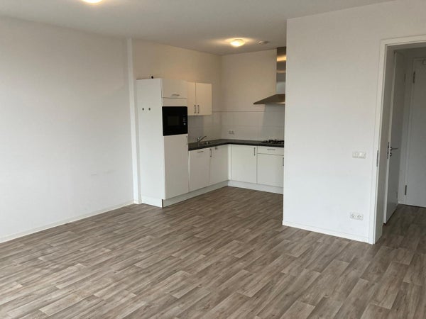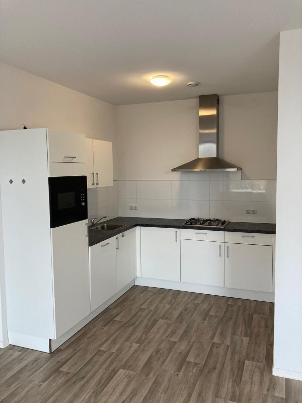 Een appartement met twee slaapkamers, badkamer en een woonkamer met een open keuken. De keuken is uitgerust met inbouwapparatuur (elektrische kookplaat, afzuigkap, vaatwasser en koel-vriescombinatie). De badkamer beschikt over een inloopdouche, wastafel, en een kast. Opstelplaats voor wasmachine/droger in een aparte ruimte.
