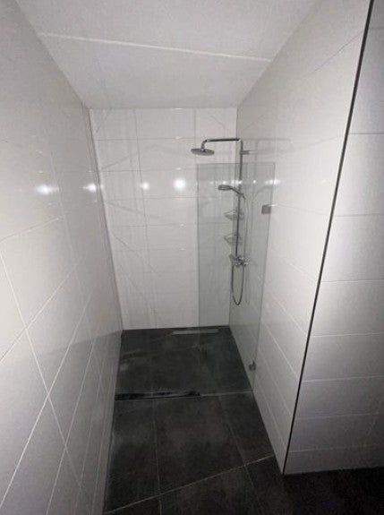 - Badkamer voorzien van badkamermeubel met dubbele wastafel, grote spiegel en doucheruimte