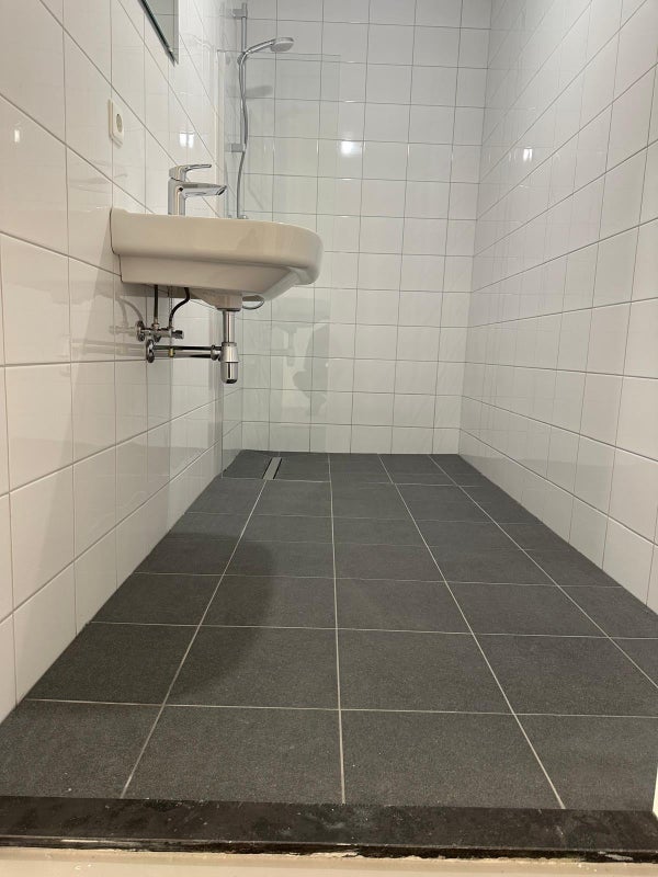 De badkamer is afgewerkt en uitgerust met een inloopdouche, wastafel en een spiegel met ingebouwde verlichting. Verwarming vindt plaats via een energiezuinige warmte-unit. De foto's in de advertentie zijn gemaakt tijdens de renovatie.