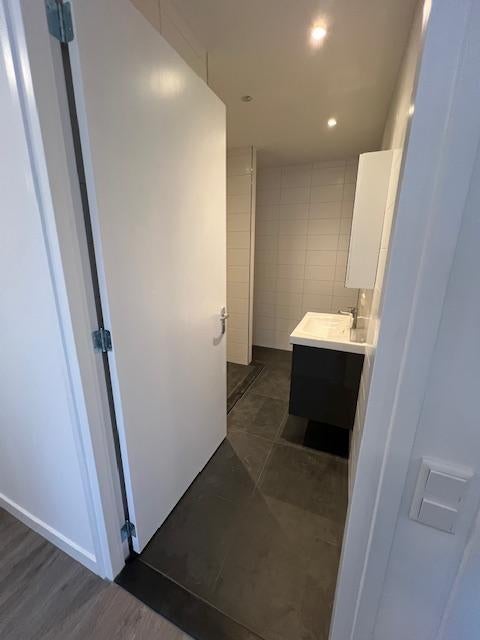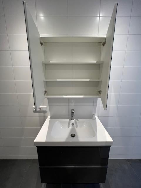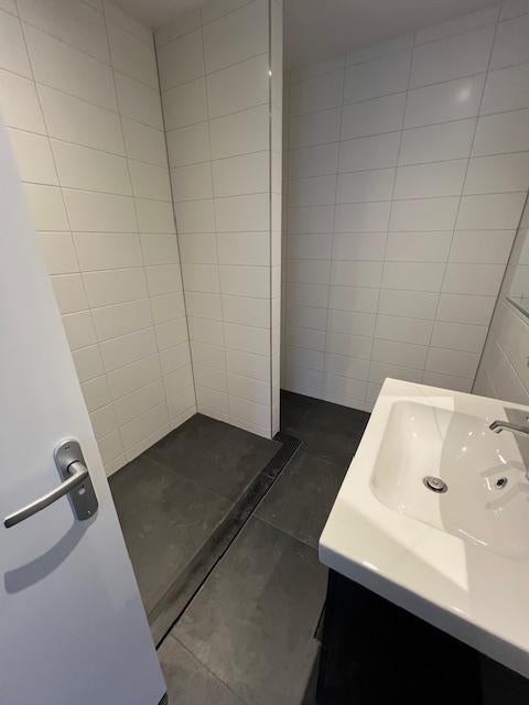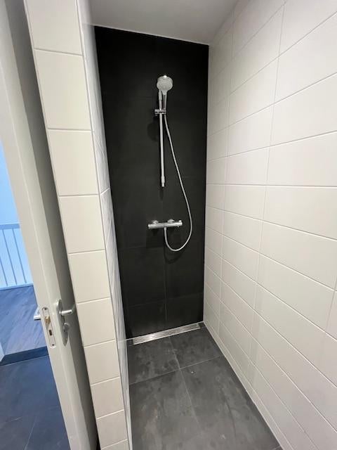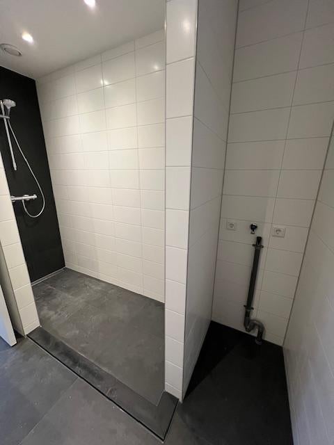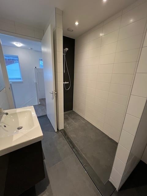 - een luxe badkamer met inloopdouche, een zeer net wastafel meubel en de witgoed aansluitingen