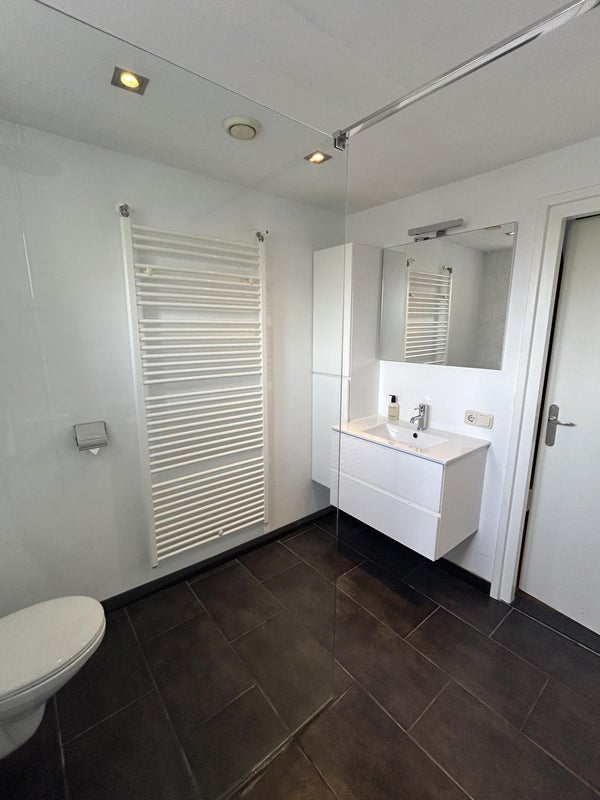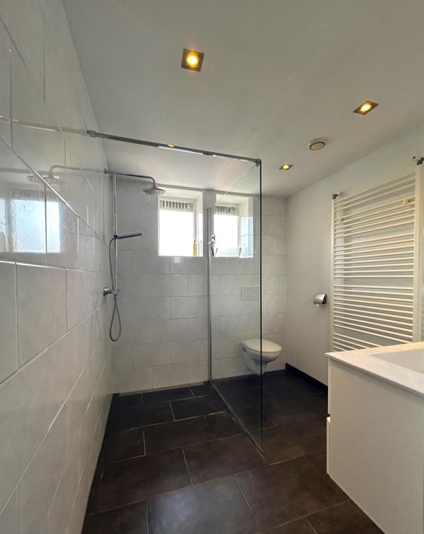 De moderne bathroom is uitgerust met een royale inloopdouche, wastafel en een tweede toilet.