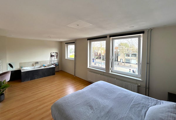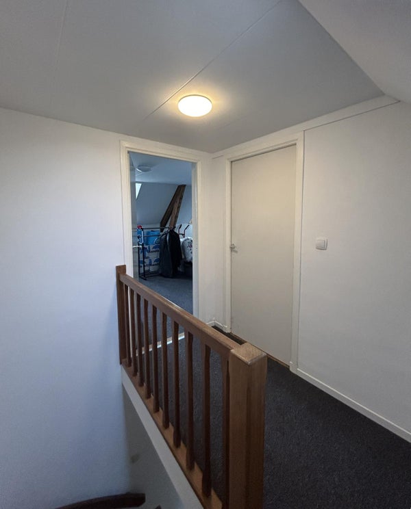 De overloop is voorzien van een nette laminaatvloer en biedt toegang tot de slaapkamers en de badkamer. Aan de voorzijde bevindt zich de ruime hoofdslaapkamer met een eigen bad, een heerlijke plek om te ontspannen. Aan de achterzijde ligt de tweede slaapkamer, eveneens voorzien van laminaat. Op de overloop bevindt zich bovendien een praktische kast, ideaal als opbergruimte of garderobekast.
