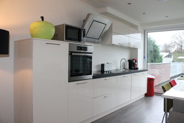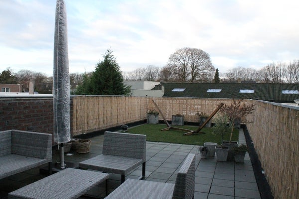 De keuken is uitgerust met een koelkast, kookplaat, afzuigkap, oven en vaatwasser. Vanuit de keuken is het royale dakterras toegankelijk.