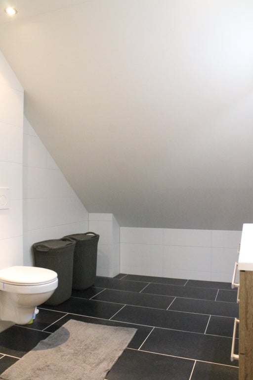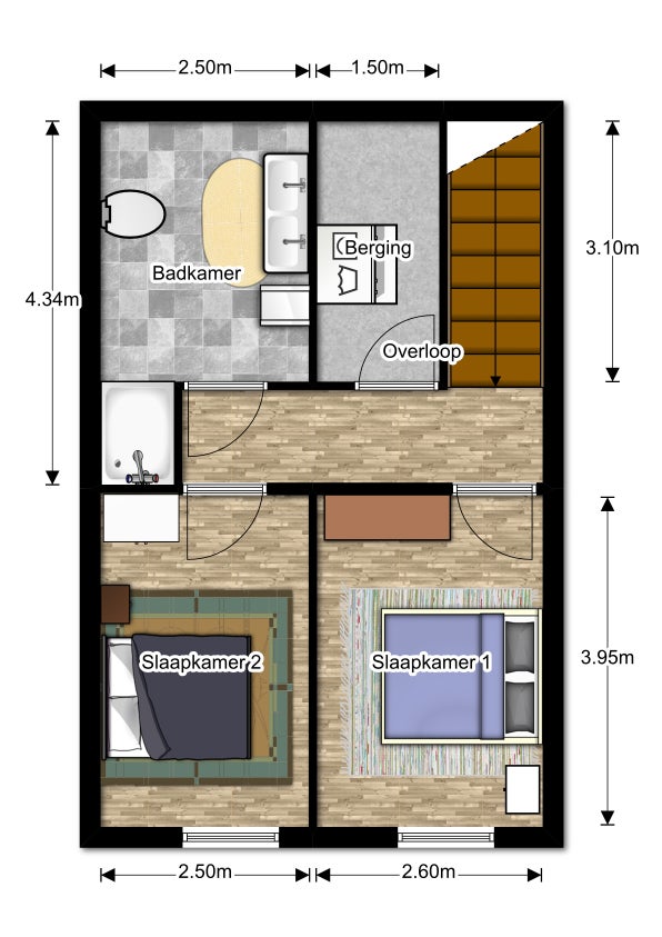 Overloop naar twee slaapkamers (beide 10 m2), royale badkamer met douchecabine, toilet en dubbele wastafels en de berging met mogelijkheid tot het plaatsen en aansluiten van witgoed.