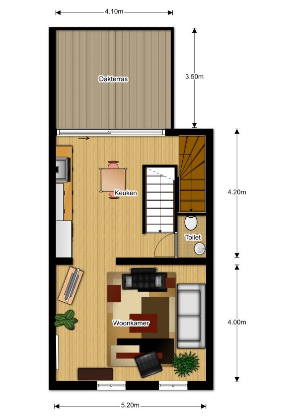 Separaat toilet, woonkeuken met keukeninstallatie v.v. koelkast, kookplaat, afzuigkap, oven en vaatwasser, trapopgang naar verdieping en woonkamer (gezamenlijk 39 m2). Vanuit de keuken is een ruim dakterras (24 m2) bereikbaar.