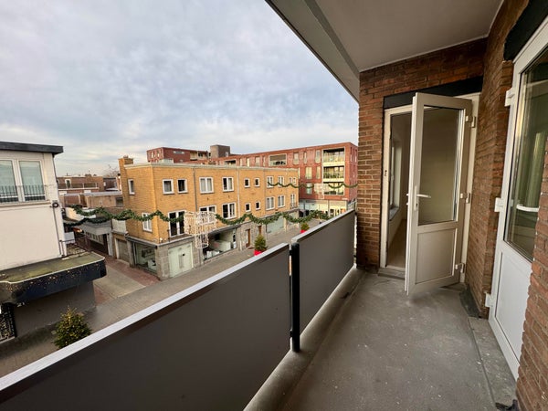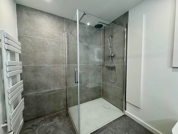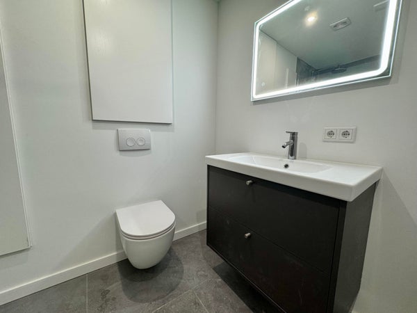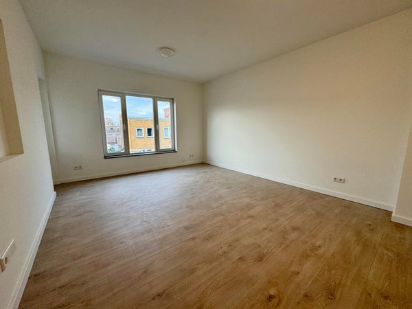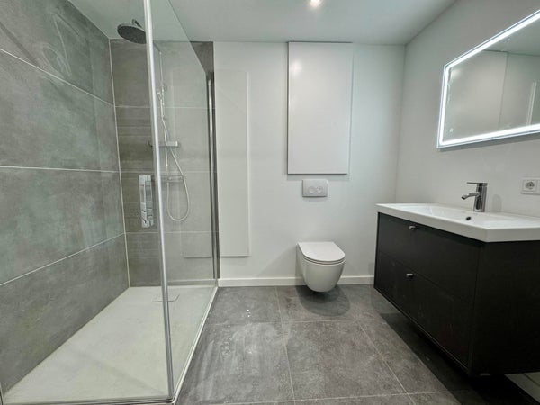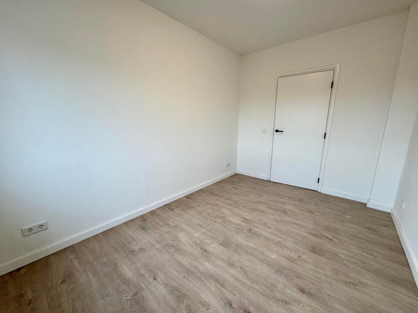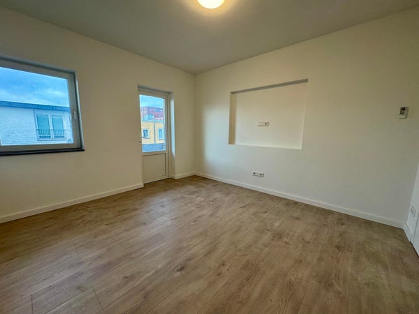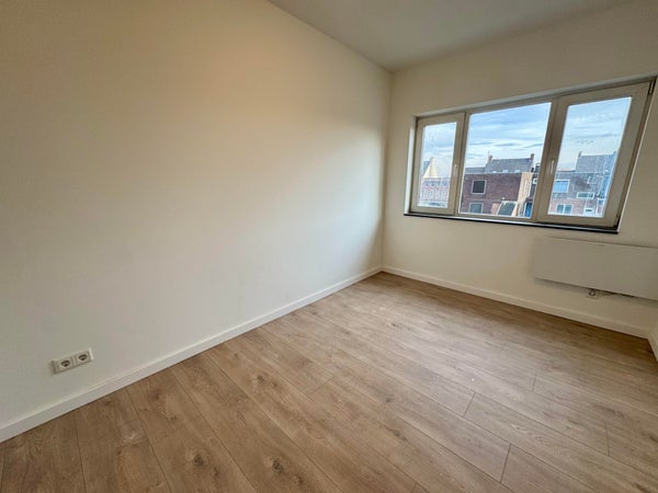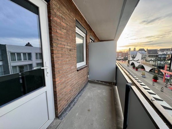 Aan het einde van de hal bevindt zich de hoogwaardig afgewerkte badkamer, uitgerust met een inloopdouche, hangend toilet, wastafelmeubel en aansluiting voor de wasmachine. Aan de linkerzijde van de woning vind je de lichte woonkamer en de tweede slaapkamer. In zowel de woonkamer als de slaapkamer bevindt zich een praktische inham die perfect geschikt is voor het realiseren van een strak afgewerkte cinewall, voor een moderne en luxe uitstraling. Beide ruimtes bieden tevens toegang tot het tweede balkon aan de voorzijde, vanwaar je uitzicht hebt over het centrum.
