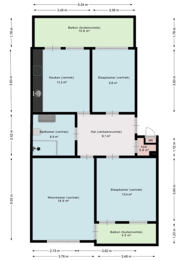 Bij binnenkomst betreed je de zeer ruime hal die toegang biedt tot alle vertrekken van de woning. Aan de rechterzijde bevindt zich de luxe keuken, voorzien van alle benodigde inbouwapparatuur, met directe toegang tot het eerste balkon aan de achterzijde van het pand. Aan dezelfde zijde ligt tevens de eerste slaapkamer van circa 10 m².