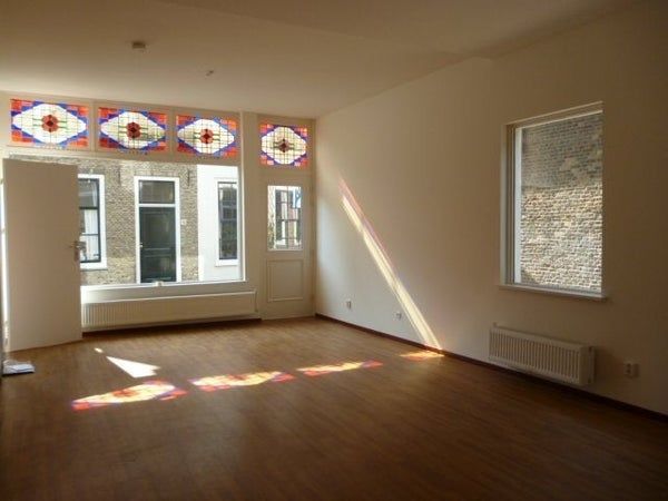 Indeling: Entree appartement, hal, meterkast, woonkamer met grote ramen met glas in lood aan de voorzijde, open keuken voorzien van gasfornuis en afzuigkap, badkamer met douchecabine, wastafel, toilet en wasmachine aansluiting, aparte slaapkamer met raam in de steeg en deur naar gemeenschappelijke binnenplaats.