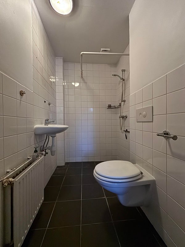 De badkamer is voor van inloopdouche, wastafel en toilet.
