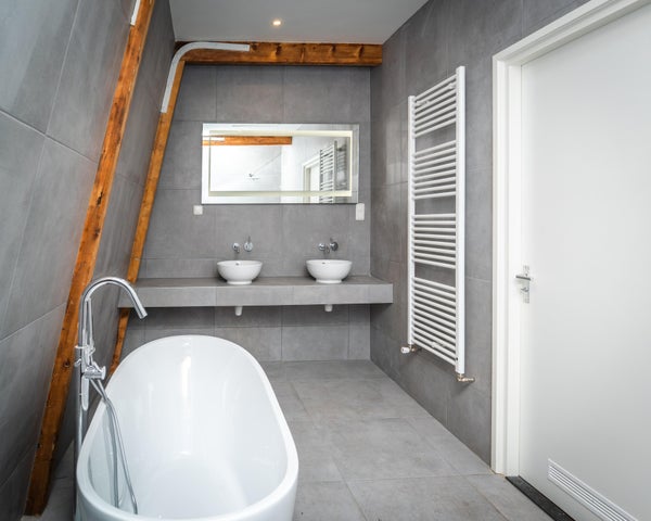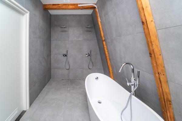 De badkamer van circa 7,5 m2 is voorzien van prachtig grote grijze tegels, dubbele wastafelkommen, een luxe spiegel met ingebouwd licht, design radiator én een vrijstaand ligbad. De inloopdouche is extra groot uitgevoerd met maar liefst twee stortdouches. De douchekoppen zijn ingebouwd in de wand. Beide douches hebben ook nog een separaat handdouche. Kortom, alle comfort die je je maar kunt wensen. Het toilet is overigens separaat tegenover de badkamerruimte gesitueerd. Aan de achterzijde van het appartement bevinden zich de twee slaapkamers van ca. 10 m2 en 11 m2. Tevens heeft het appartement een breed privé balkon.