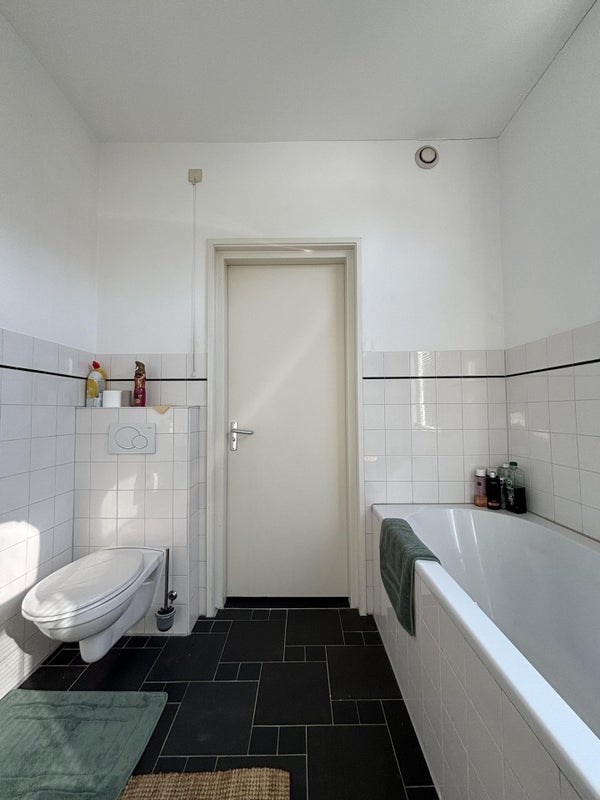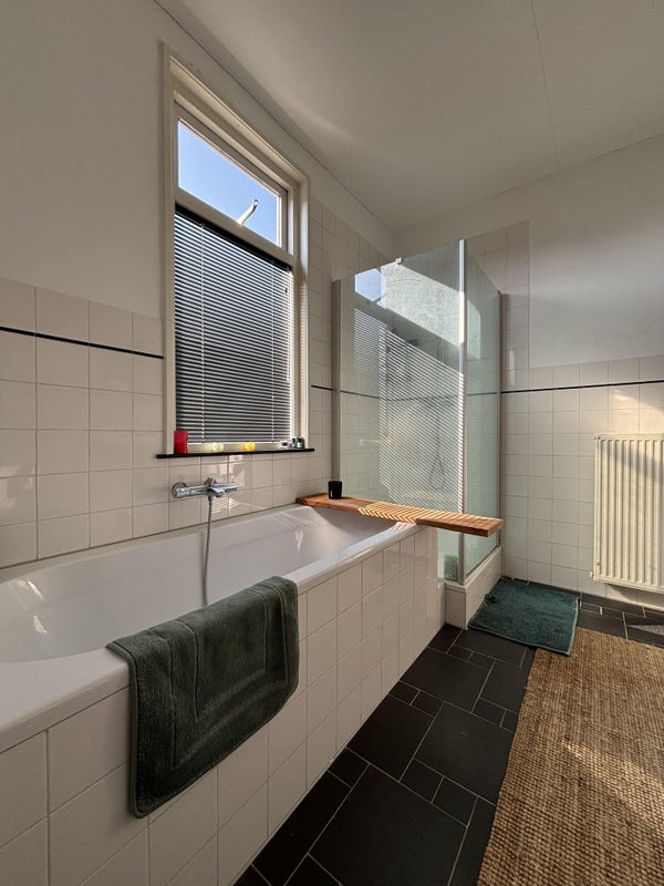 De moderne badkamer is voorzien van toilet, wastafel, douche en ligbad.