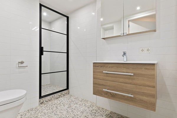 Twee slaapkamers in het souterrain met ramen aan de tuinzijde. Moderne luxe badkamer met regendouche, wastafelmeubel en 2e toilet.