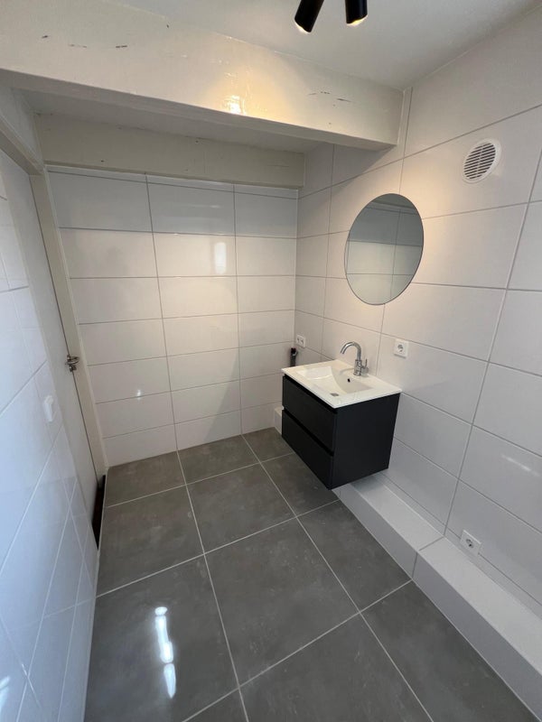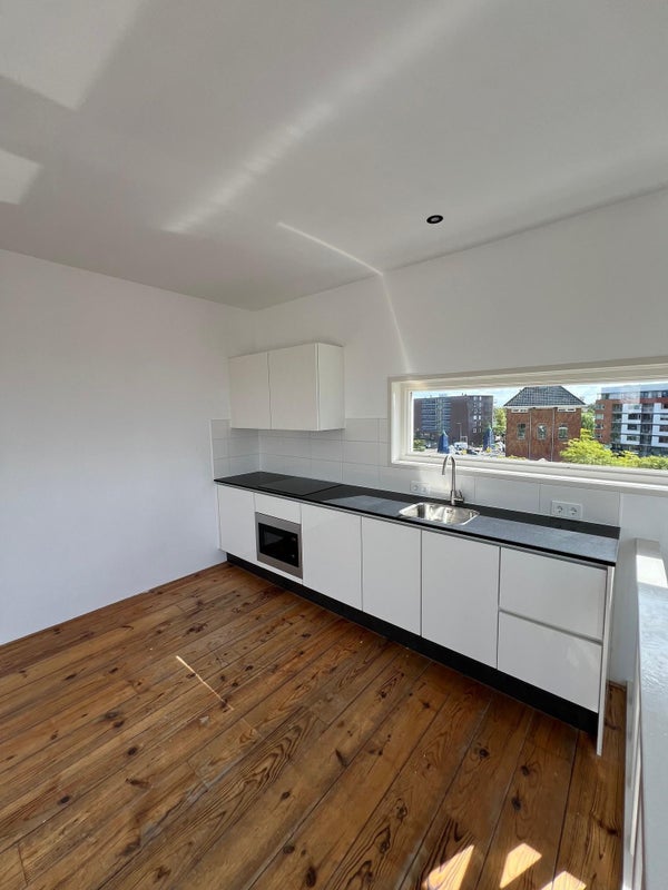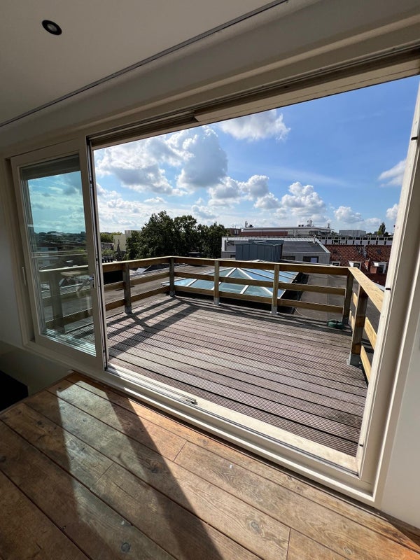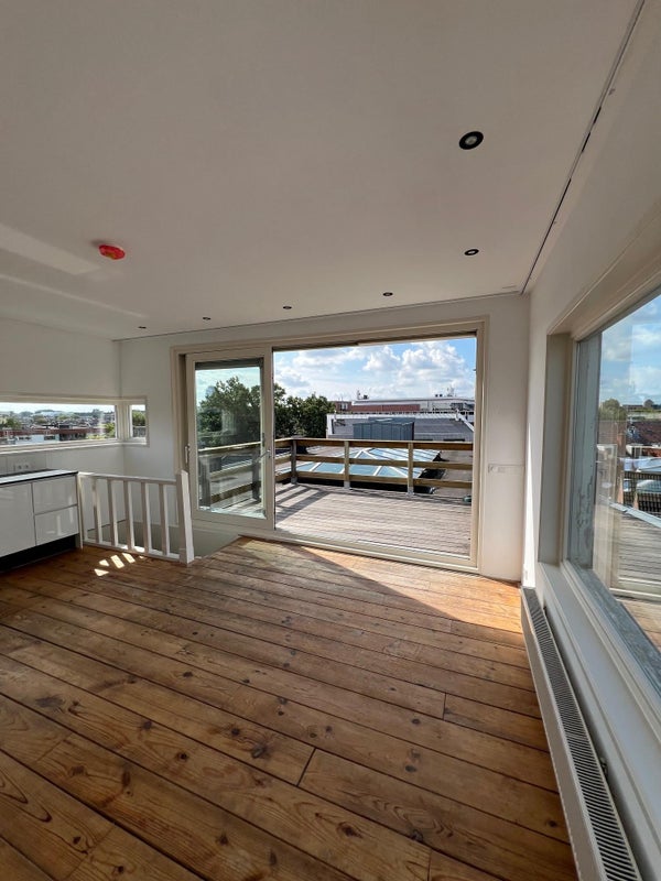 Hal/Entree met toegang tot de volgende ruimtes: slaapkamer, separaat toilet en badkamer met inloopdouche, wastafel en een aansluiting voor een wasmachine/droger. Vanuit de hal komt men via de trap in de woonkamer met open keuken. De lichte woonkamer bevindt zich op het pand en heeft geen buren naast of onder zich. Doordat de woonkamer zich op de bovenste etage bevindt heeft men een prachtig uitzicht over de stad! Daarnaast bereikt men via de schuifpui het ruime dakterras.