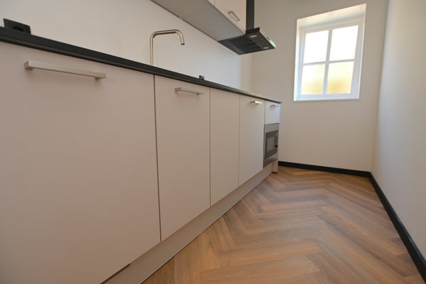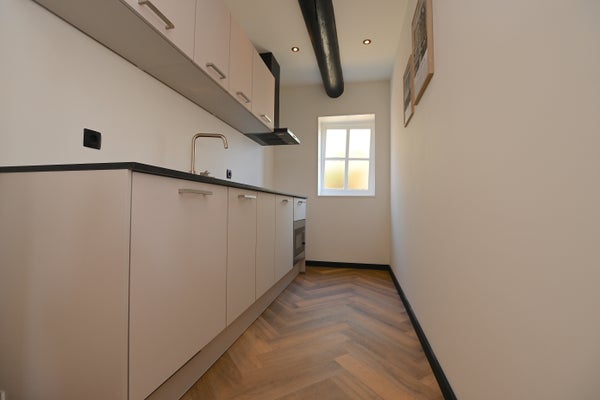 Via de voordeur kom je in de ruime hal die toegang geeft tot de lichte woonkamer. In de woonkamer zijn de oude elementen van het gebouw behouden en gecombineerd met moderne aspecten. Aansluitend aan de woonkamer bevindt zich de strakke keuken die voorzien is van koelkast met vriesvak, inductiekookplaat, afzuigkap, combioven en spoelbak. De keuken is tevens voorzien van voldoende opberg- en werkruimte.